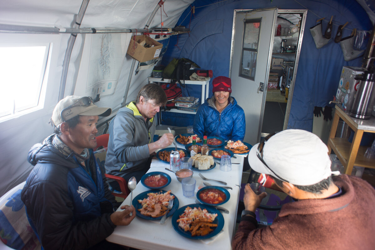 Our heated base camp tent serves as both a dining & relaxation area for ALE guided guests and an operations center for mountain logistics. Meals are often prepared on-site with fresh ingredients and sometimes include fresh-frozen meals prepared in advance by our chefs at Union Glacier.