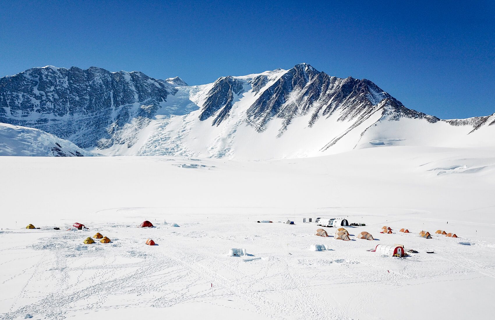A snow-covered campsite with colorful tents is set up on a vast, white expanse in Antarctica before towering, rugged, snow-capped mountains under a clear blue sky—an inspiring scene from an Antarctic Logistics and Expeditions journey.