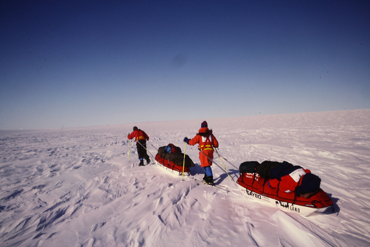 Ran Fiennes and Mike Stroud pull heavily laden sleds at the start of their 1992 Antarctic expedition. The pair made the first unsupported crossing of the Antarctic continent.