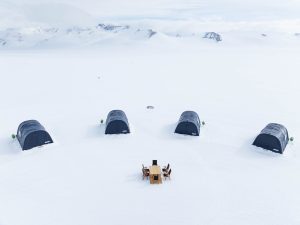 Interior of dining tent and lounge area at Three Glaciers Retreat.