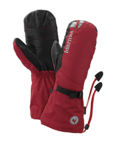A pair of red and black Marmot mittens with wrist straps and drawcords, designed for harsh South Pole conditions, shown from the front and back against a white background.