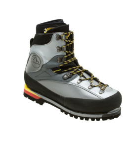 A gray and black mountaineering boot with yellow and black laces, rugged black sole, and red and yellow accents on the heel, designed for outdoor adventures from alpine peaks to Antarctic Logistics and Expeditions at the South Pole.
