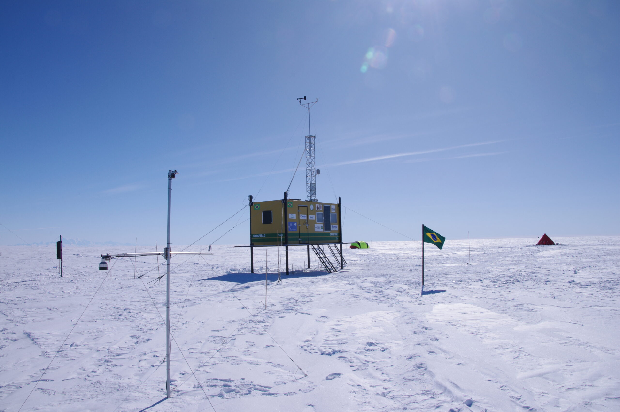 A small green and yellow research station stands on a snowy, flat landscape in Antarctica under a clear blue sky, with scientific instruments, a Brazilian flag, and Antarctic Logistics and Expeditions tents visible nearby.