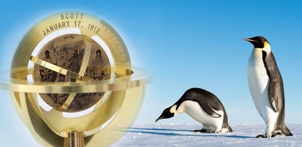 A brass sundial engraved with SCOTT JANUARY 17, 1912 and an image of explorers stands beside two emperor penguins on snow under a clear blue sky.
