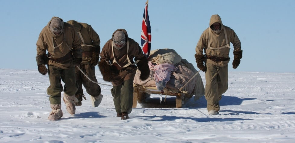 Four people in heavy winter gear pull a sled loaded with supplies and a British flag across a snowy, icy landscape under a clear blue sky.