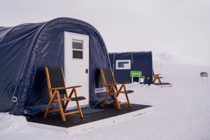 Exterior of guest tents at Three Glaciers Retreat, with chairs on porch.
