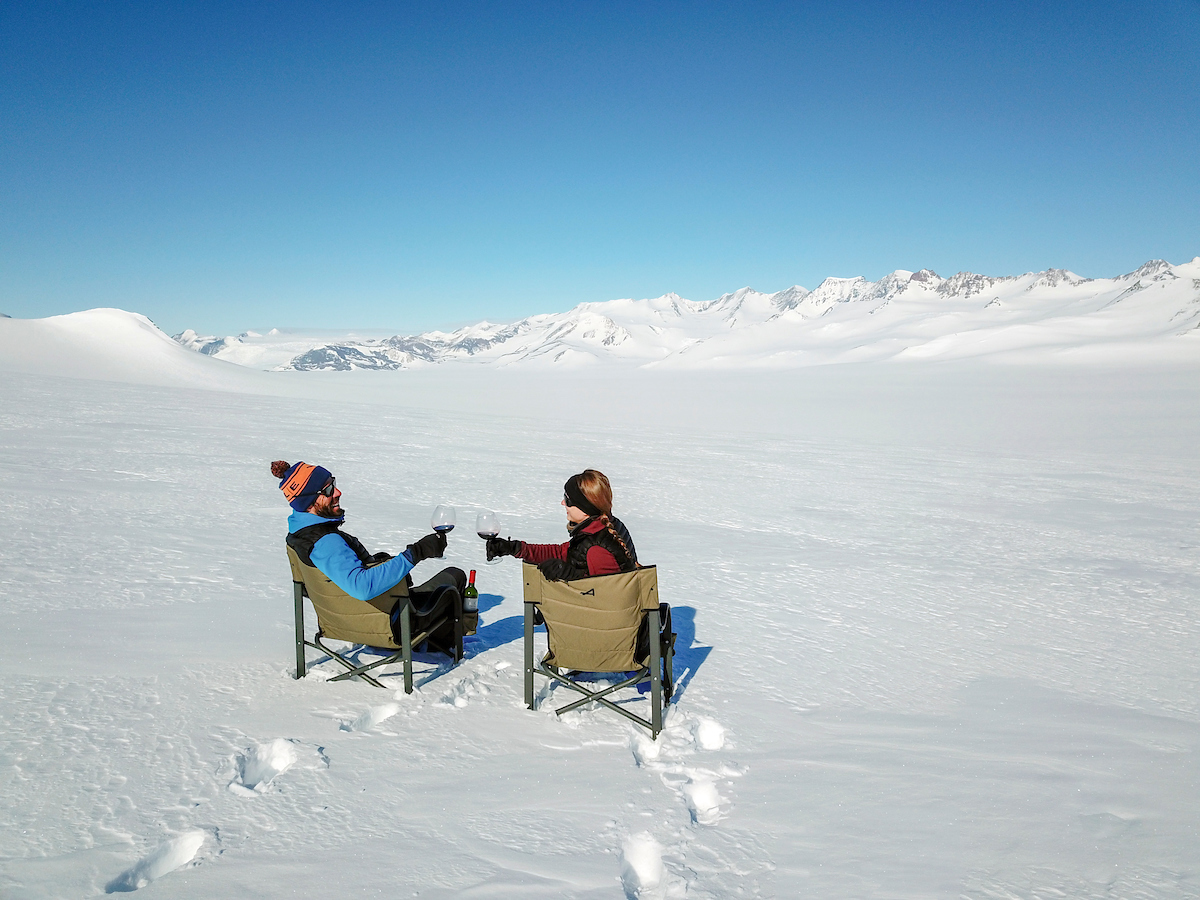 Guests enjoy a glass of wine and the view at Three Glaciers Retreat.
