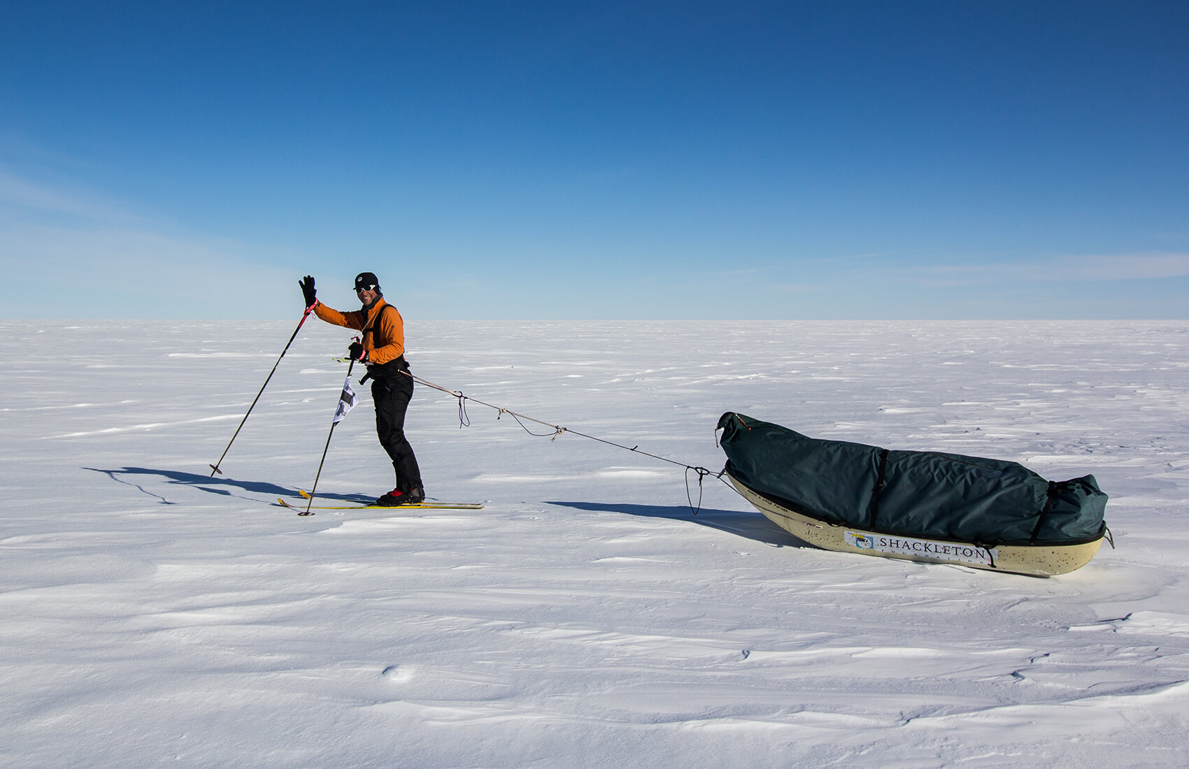 A person in an orange jacket skis across a vast snowy landscape in Antarctica, pulling a sled loaded with gear under the clear blue sky, reminiscent of South Pole expeditions supported by Antarctic Logistics and Expeditions.