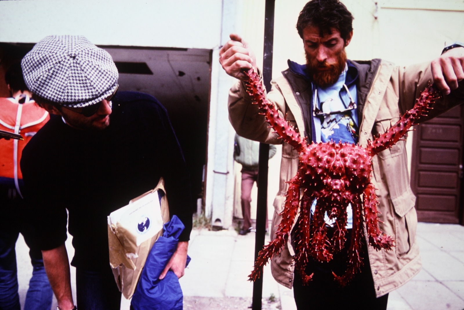 A man holding a large, red spiky crab by its legs while another man wearing sunglasses and a cap looks at it; they are standing outside on a city sidewalk, discussing Antarctic Logistics and Expeditions.