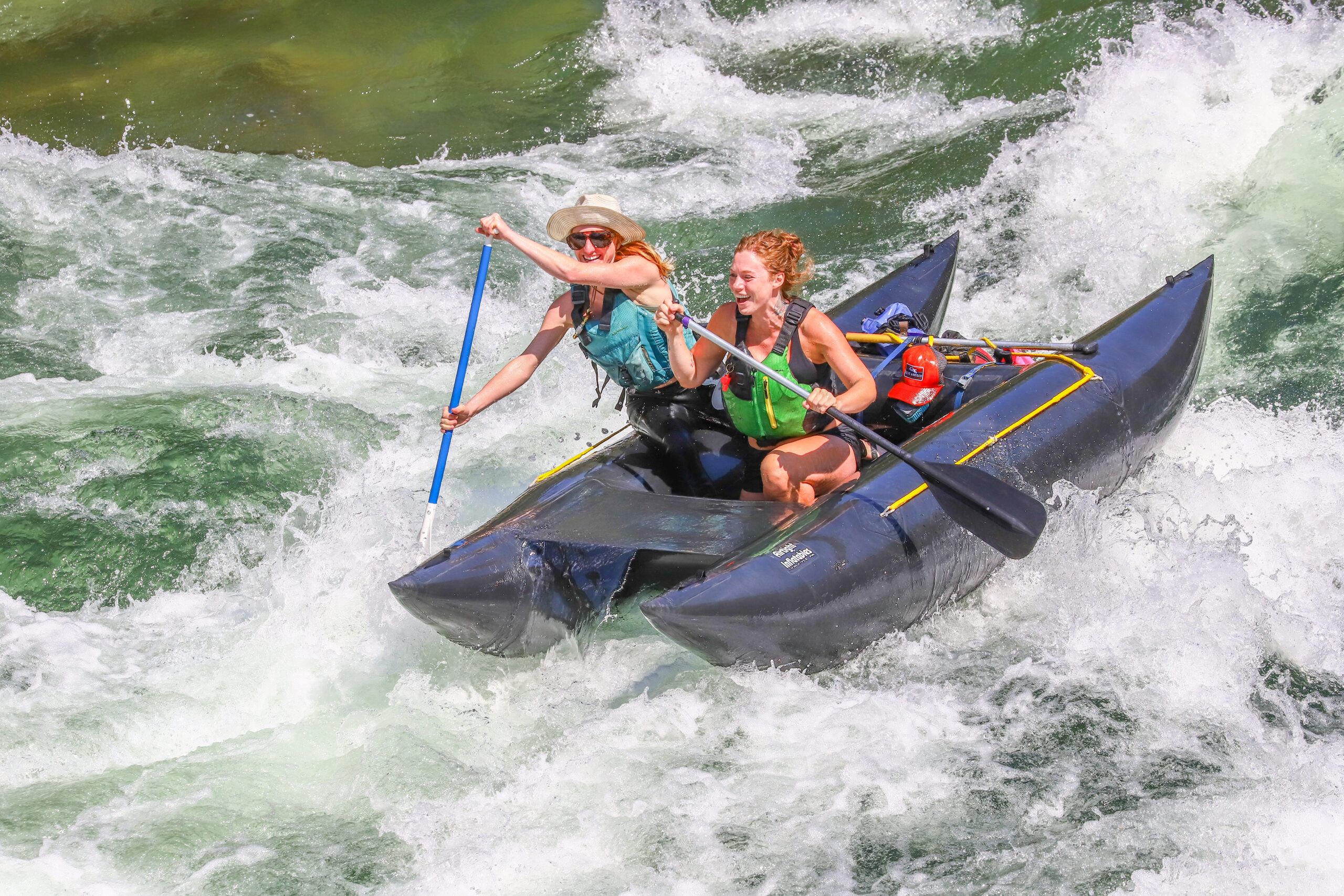 Two women wearing life jackets paddle a small inflatable raft through whitewater rapids, smiling and enjoying the adventure—an experience reminiscent of Antarctic Logistics and Expeditions in the wild beauty of Antarctica.