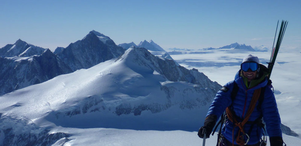 A climber in winter gear and goggles stands on a snowy mountain ridge in Antarctica, with snow-covered peaks and a vast, icy landscape stretching behind—a thrilling adventure supported by Antarctic Logistics and Expeditions.