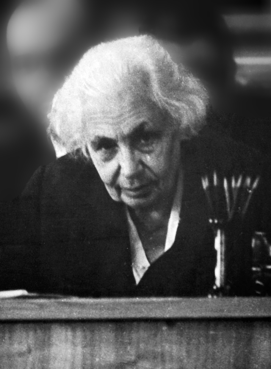An elderly woman with white hair and a serious expression sits behind a desk with a few pens in a holder, dressed in dark clothing, in a black-and-white photograph, reminiscent of pioneers preparing for Antarctica or South Pole expeditions.