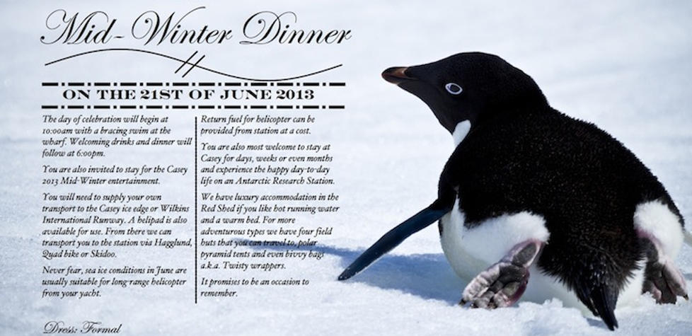 A penguin lies on snowy ground beside text inviting people to a Mid-Winter Dinner on June 21, 2013, at Casey station in Antarctica, describing the celebration and Antarctic Logistics and Expeditions travel details.
