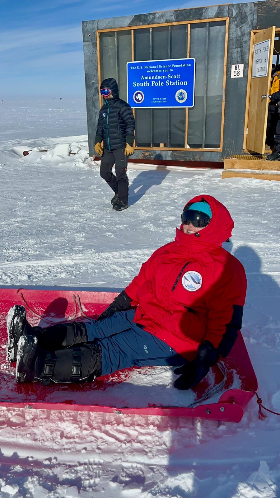 A person in a red parka and snow boots sits in a sled on the snow near the Amundsen-Scott South Pole Station, as another in winter gear stands nearby—capturing a moment from an unforgettable overnight trip at the South Pole.