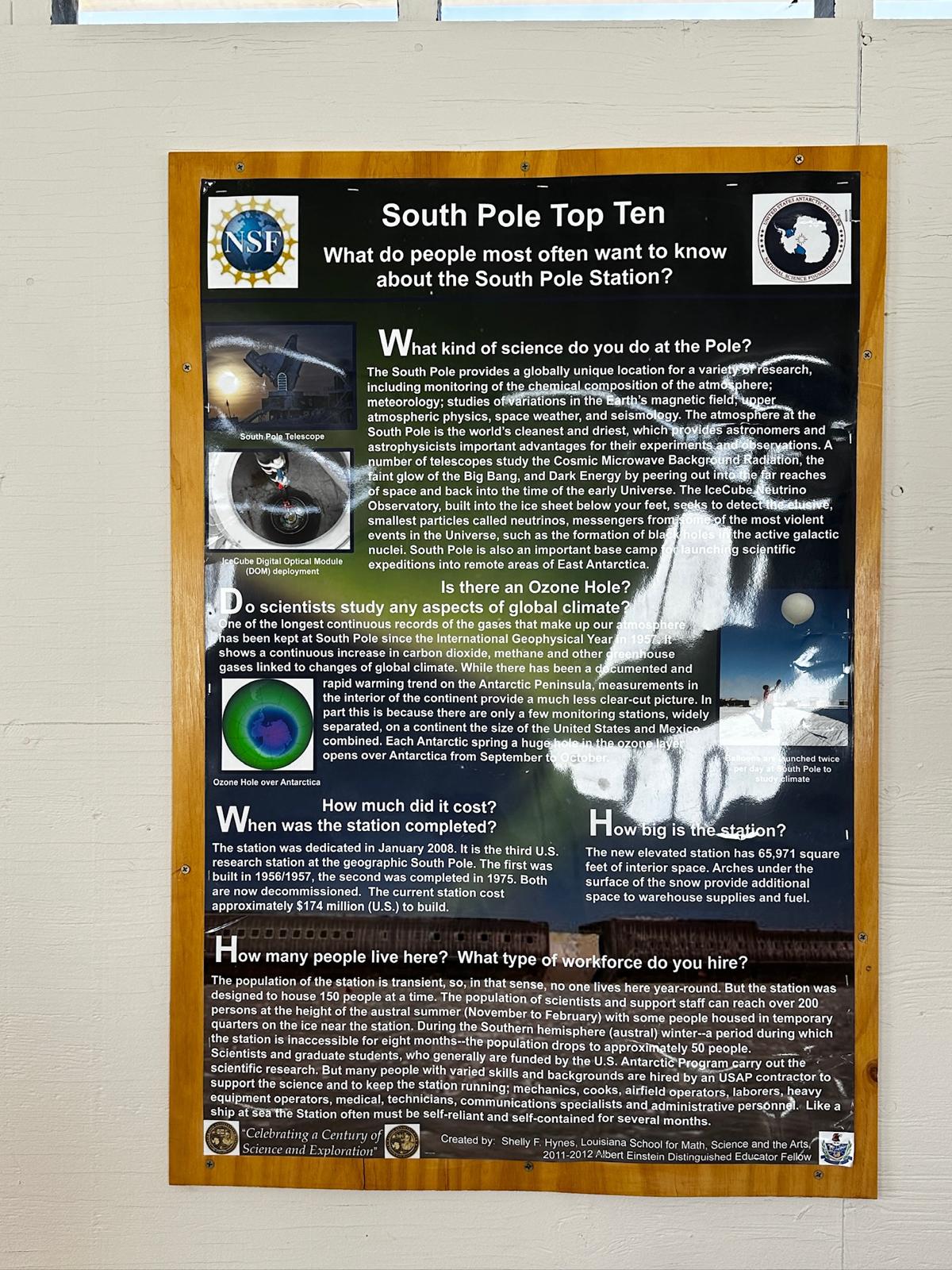 Poster titled “South Pole Top Ten” with text and images answering common questions about the South Pole Station—including science, cost, population, size, ozone hole, ice thickness, and what an overnight trip at the South Pole involves. White wall background with some reflections.