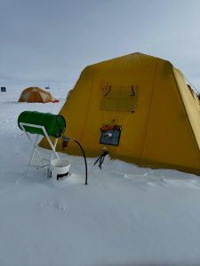 A yellow tent is set up on snow with a green barrel on a stand and a white bucket connected by a hose in front—an authentic scene from an overnight trip at the South Pole, with another tent in the snowy background under a cloudy sky.