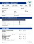 A swimming skills questionnaire form used by Antarctic Logistics and Expeditions, with sections for contact information, swim ability, previous experience, tick boxes for skills, and swim support needs. Features blue text and a wave logo at the top right.