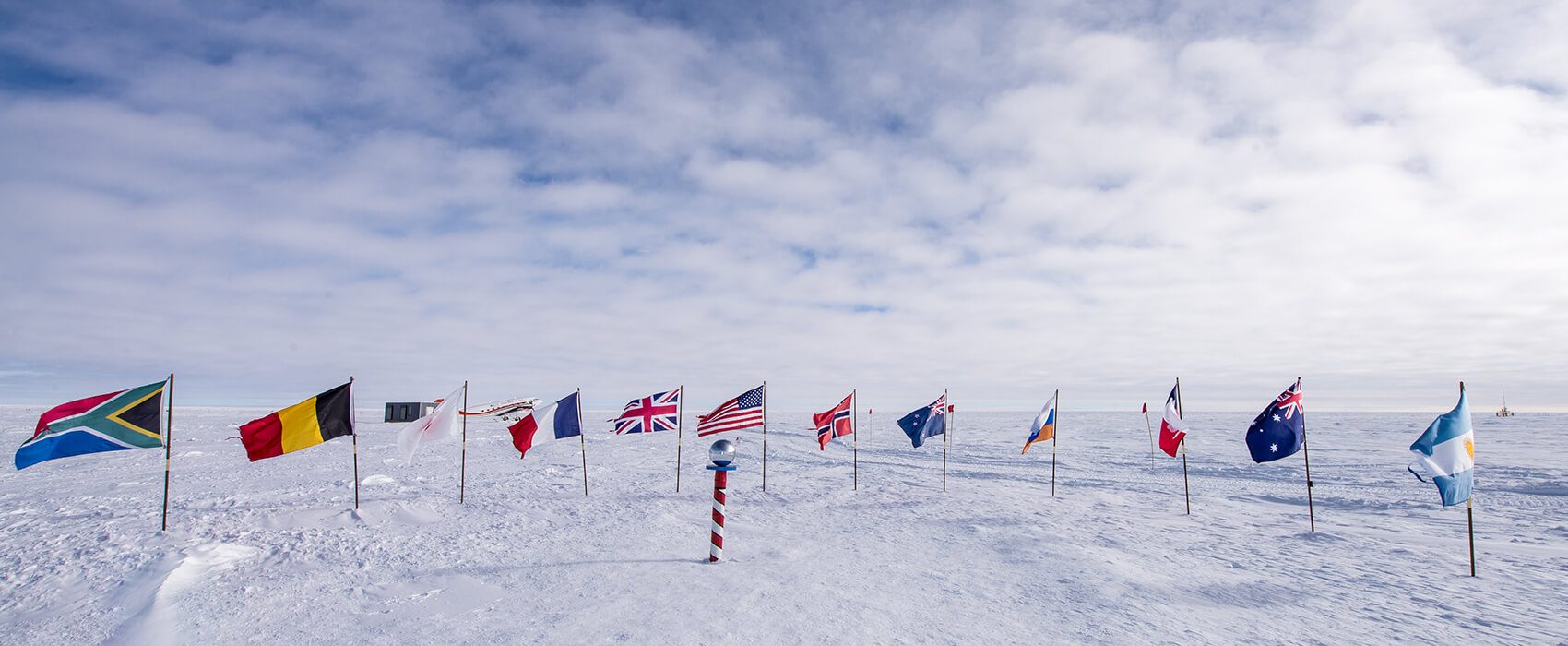 A row of international flags stands on a snowy, icy landscape in Antarctica under a cloudy sky, surrounding a red-and-white striped pole marking the South Pole.