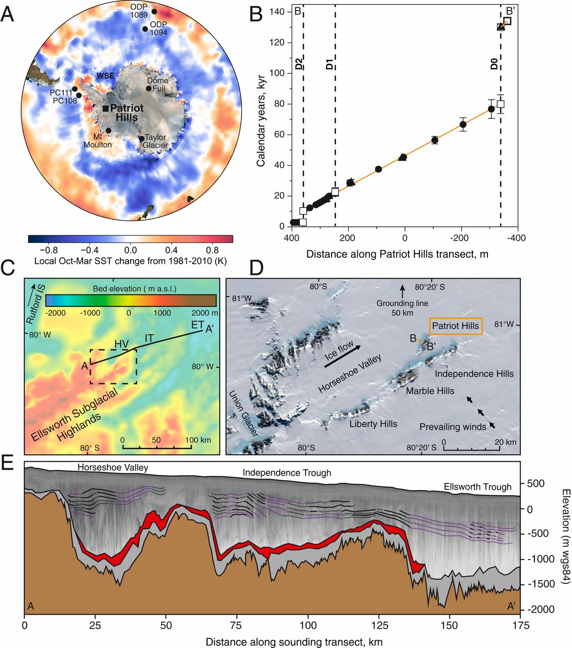 A scientific figure with five panels showing data and maps of the Patriot Hills area, Antarctica—including temperature changes, elevation profiles, and locations of hills and valleys near a key Antarctic Logistics and Expeditions route to the South Pole.