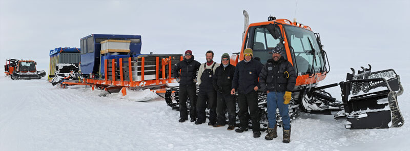 Five people in winter gear stand in front of an orange snow vehicle with treads, attached to sledges carrying equipment, on a snowy Antarctic landscape under an overcast sky, likely part of an Antarctic Logistics and Expeditions journey.