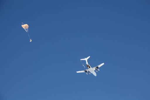 A small airplane flies in a clear blue sky above Antarctica, towing an orange and white parachute that trails behind it—a striking scene during Antarctic Logistics and Expeditions flights near the South Pole.