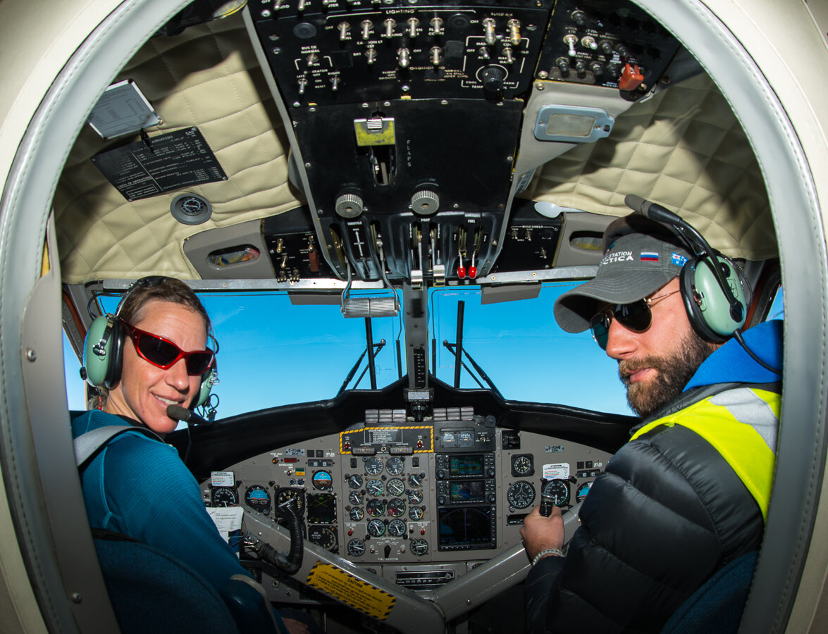 Two pilots wearing headsets and sunglasses sit in the cockpit of an Antarctic Logistics and Expeditions airplane, surrounded by control panels, looking back toward the camera with blue sky visible through the windows en route to the South Pole.