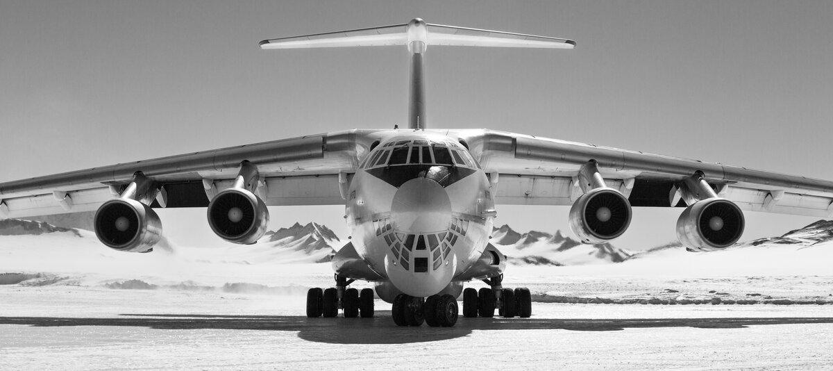 A large cargo airplane is parked on a snowy runway at the South Pole, with Antarctic mountains in the background. The image, captured in black and white, highlights the remote setting of Antarctic Logistics and Expeditions.