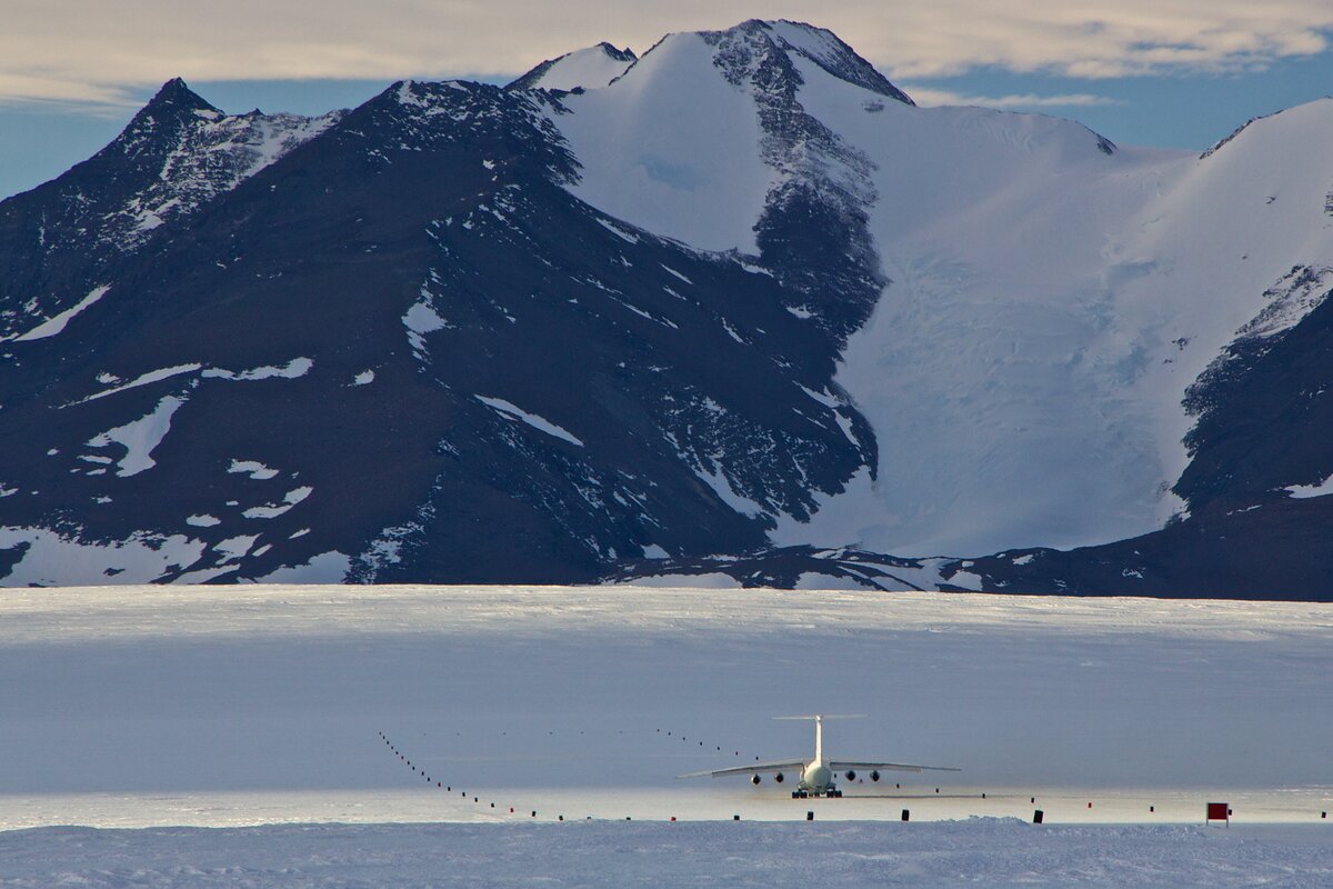 A large aircraft sits on a snowy runway surrounded by snow-covered mountains and rugged dark peaks under a partly cloudy sky in the remote, icy landscape of Antarctica.