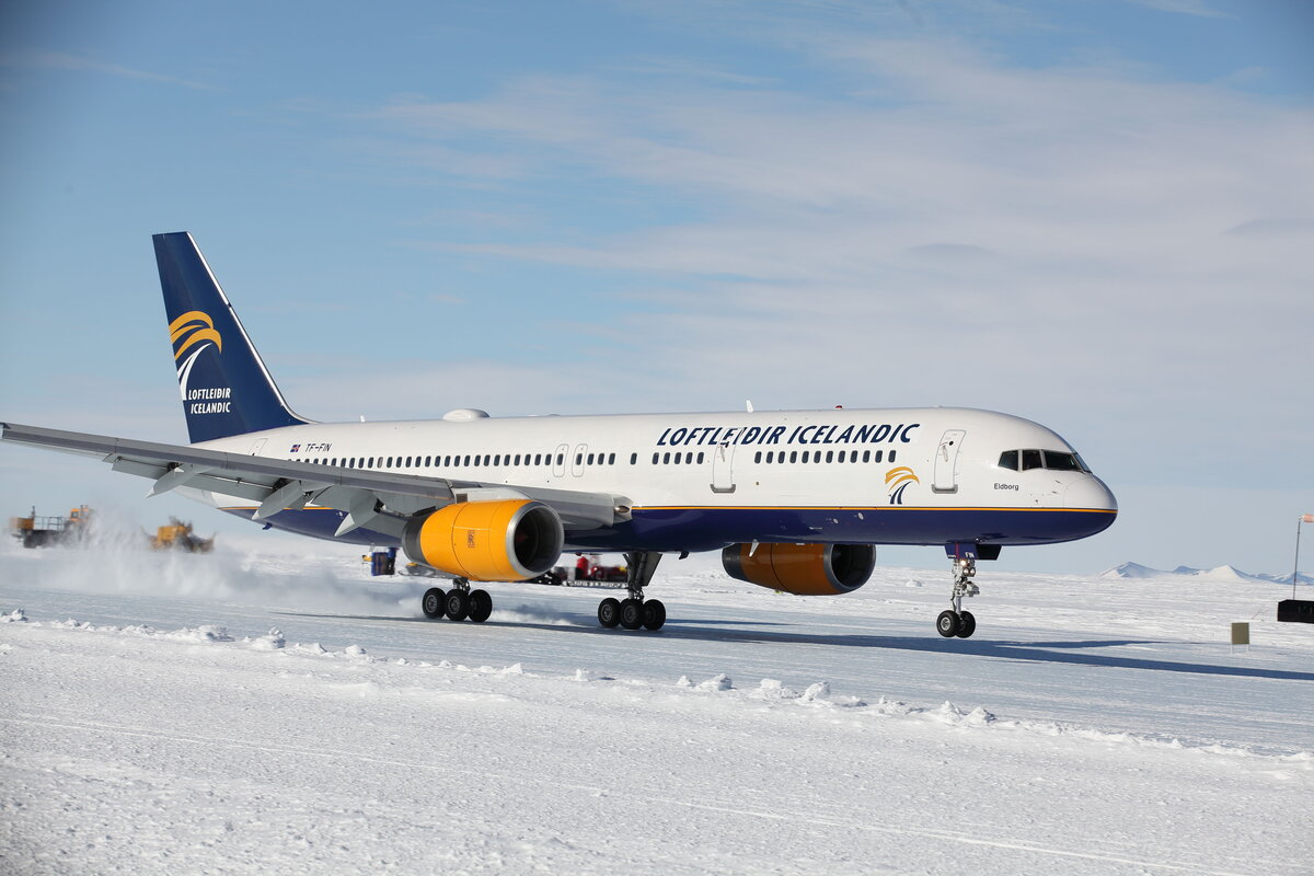 An Icelandair plane, painted white, blue, and yellow, taxis on a snowy runway under a clear sky in Antarctica. The airline logo and “Loftleidir Icelandic” text are visible on the fuselage, supporting Antarctic Logistics and Expeditions near the South Pole.
