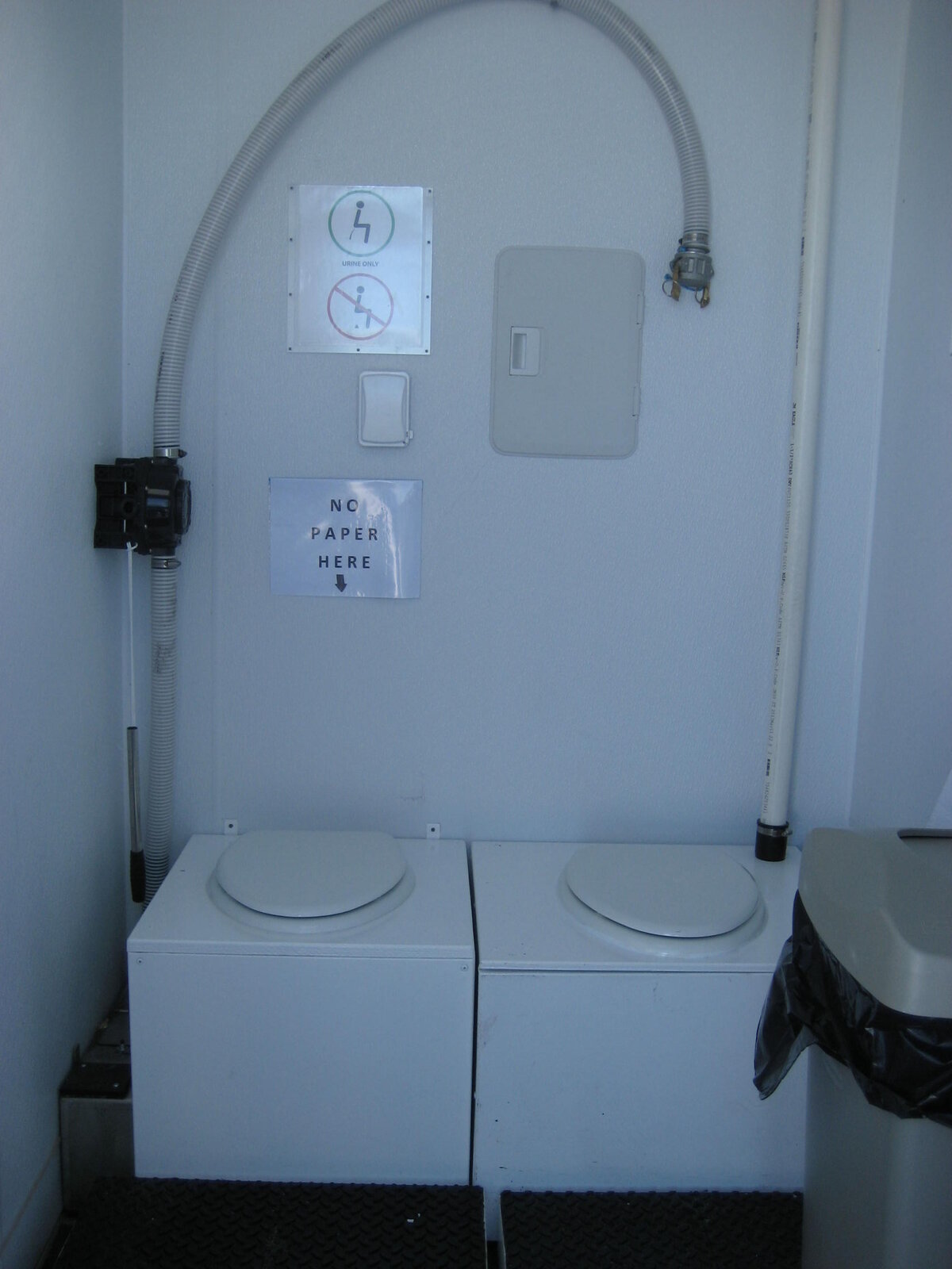 Two white toilet seats with closed lids sit side by side in a South Pole restroom. A sign above reads NO PAPER HERE. A hose runs above the toilets, and there is a trash can with a black liner on the right.