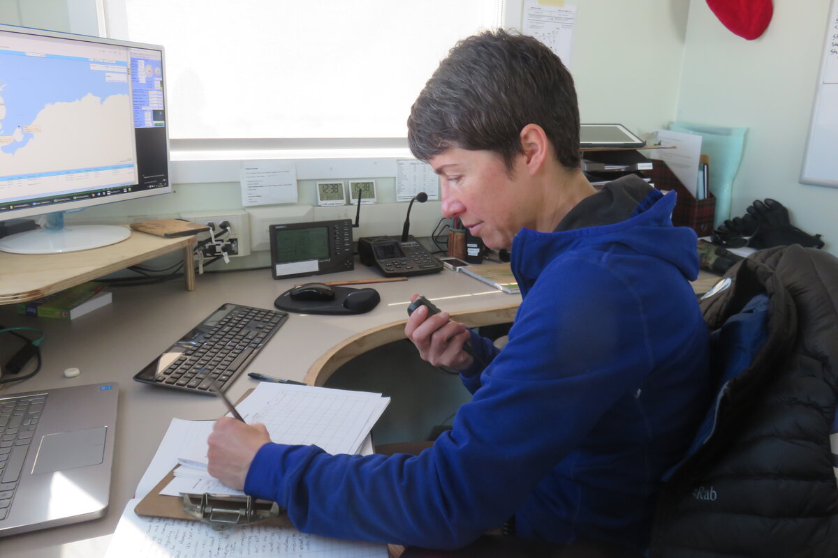 A person in a blue jacket sits at a desk at Antarctic Logistics and Expeditions, holding a radio and writing on papers. A monitor displays a map of Antarctica, with various office equipment including a laptop, phone, and clipboard nearby.