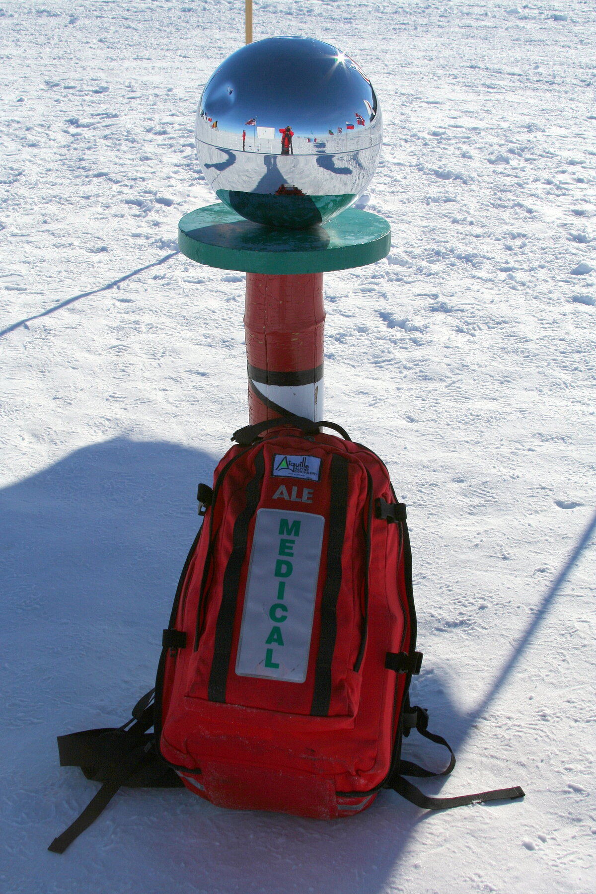 A red medical backpack labeled MEDICAL rests on snow beneath a shiny metallic sphere atop a pole at the South Pole, reflecting the Antarctic surroundings and a person taking the photo—an iconic scene of Antarctica Logistics and Expeditions.
