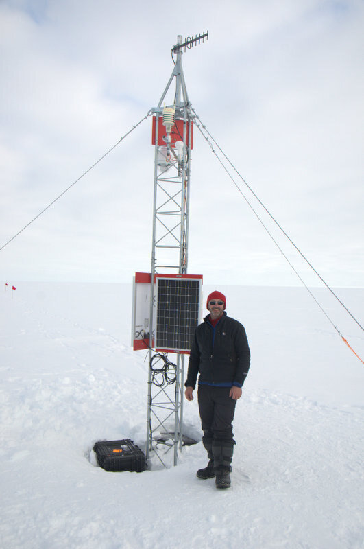 Bundled in winter clothing, a person stands next to a weather station tower with solar panels and antennas, surrounded by snow under a cloudy Antarctic sky—a scene typical of South Pole expeditions.