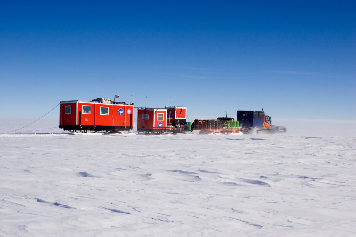 Bright red research station buildings and equipment are transported across the snowy expanse of Antarctica by a blue tracked vehicle under a clear blue sky, showcasing the vital work of Antarctic Logistics and Expeditions.