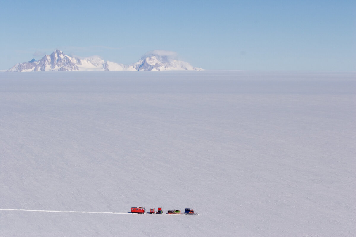 A small convoy of red vehicles from Antarctic Logistics and Expeditions travels across a vast, flat, snowy landscape with distant snow-covered mountains under a clear blue sky in Antarctica.