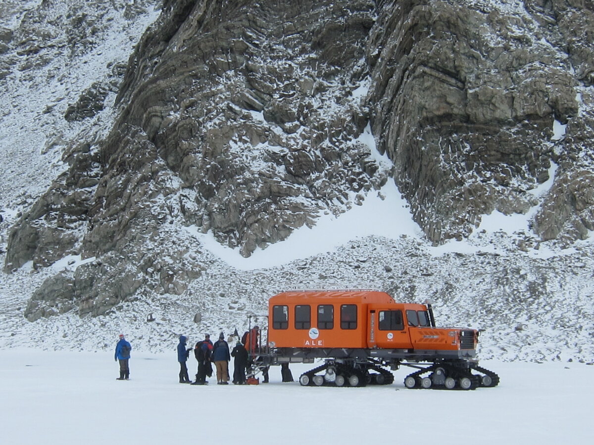 A group of people stand beside an orange tracked vehicle labeled ALE (Antarctic Logistics and Expeditions) on a snowy, frozen landscape in Antarctica, with rocky, snow-dusted cliffs in the background.