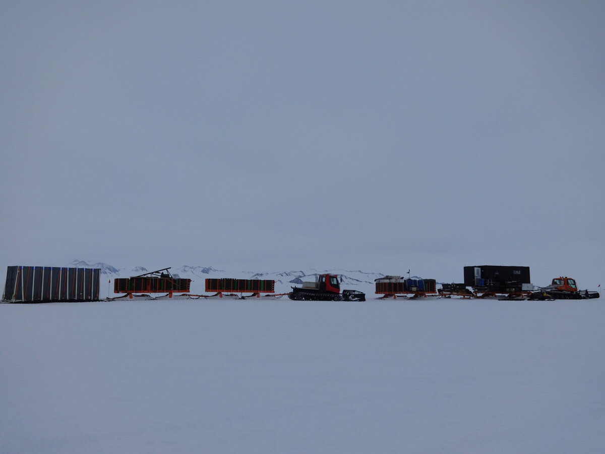 Several tracked vehicles haul large sledges carrying equipment and containers across a vast, snowy landscape in Antarctica, with distant mountains visible under an overcast sky—a scene typical of Antarctic Logistics and Expeditions near the South Pole.