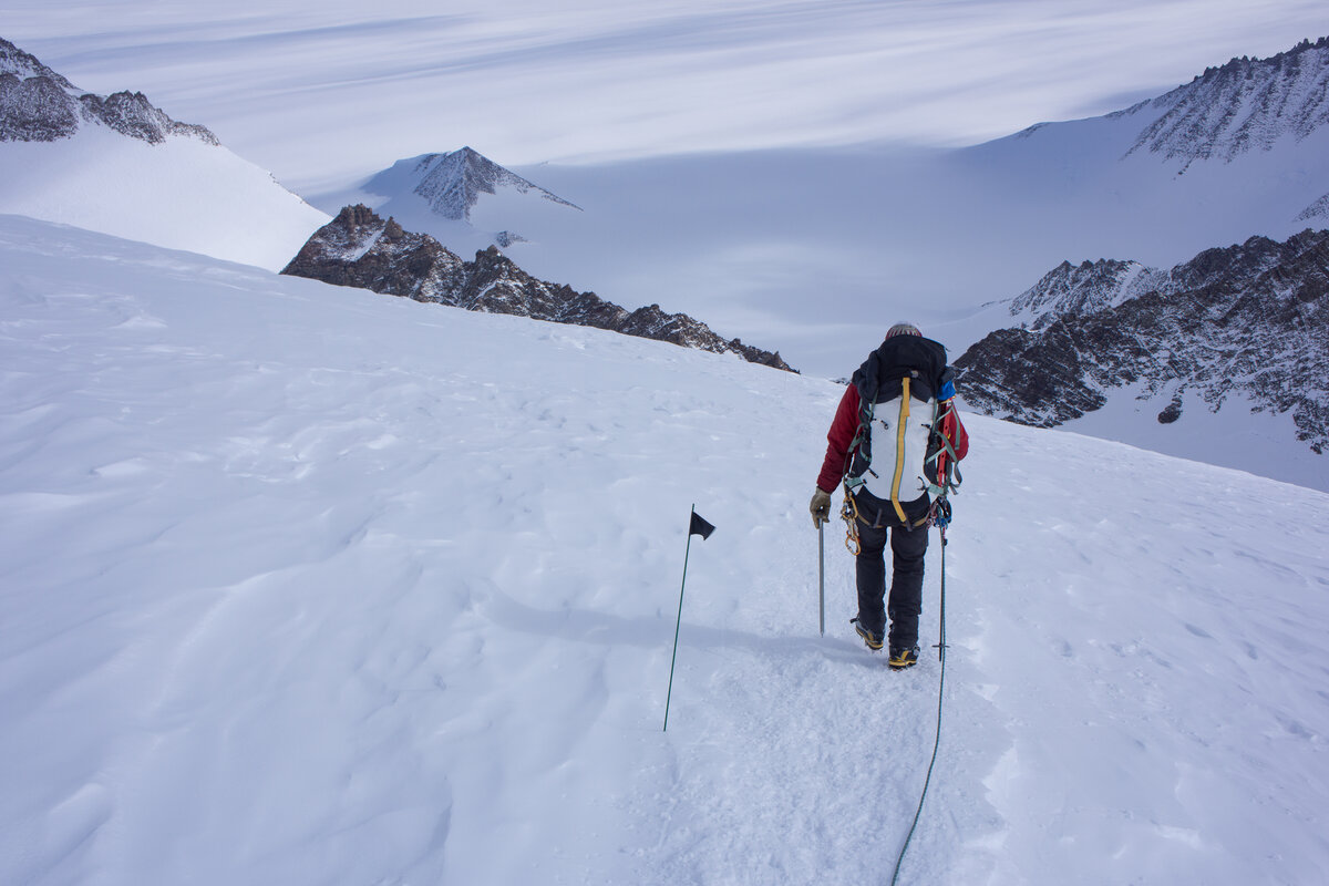 A climber in winter gear and a backpack walks up a snowy mountain slope in Antarctica, following a rope past a small black flag, with rugged peaks and the vast Antarctic landscape stretching behind him.