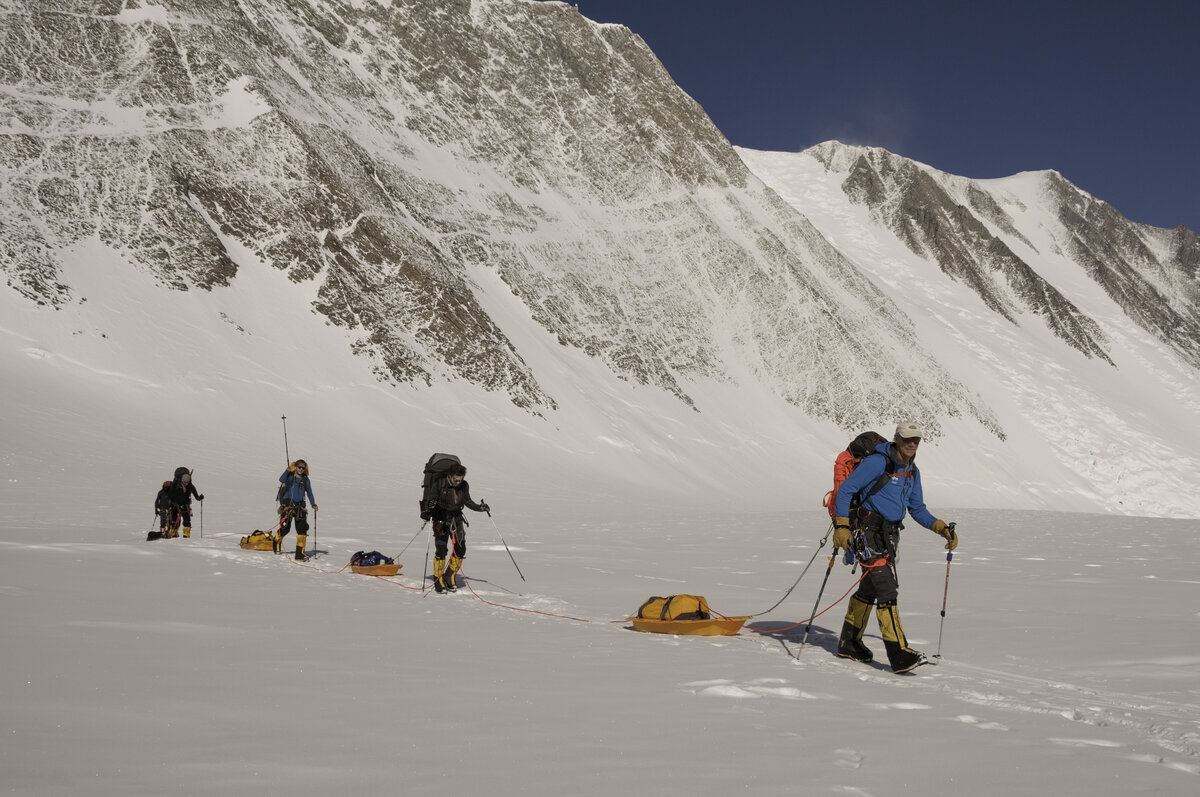 Four climbers in winter gear are pulling sleds with supplies across a snow-covered Antarctic landscape, with steep mountain slopes in the background under a clear blue sky—a classic scene of South Pole expeditions.