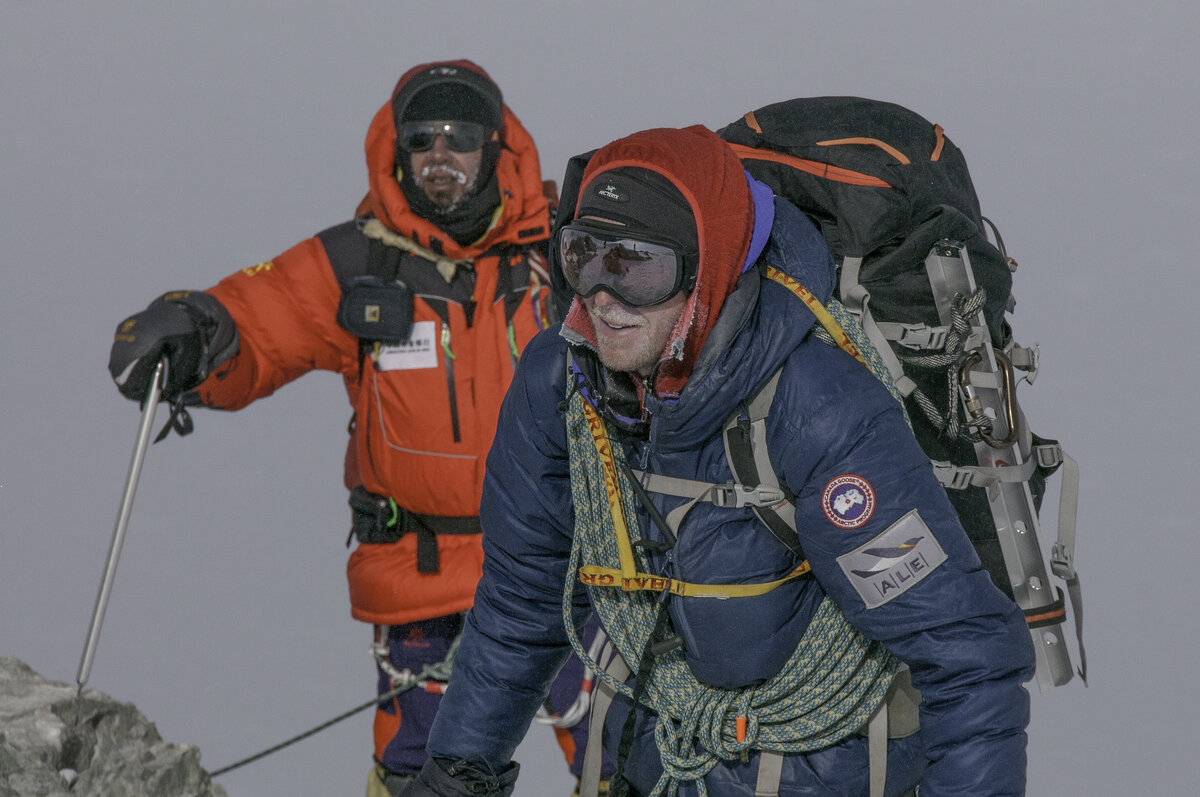 Two climbers in heavy winter gear, goggles, and backpacks ascend a snowy, foggy mountain in Antarctica. One is in a red jacket holding a pole; the other in blue with rope coiled around their chest. Visibility is low—true South Pole conditions.