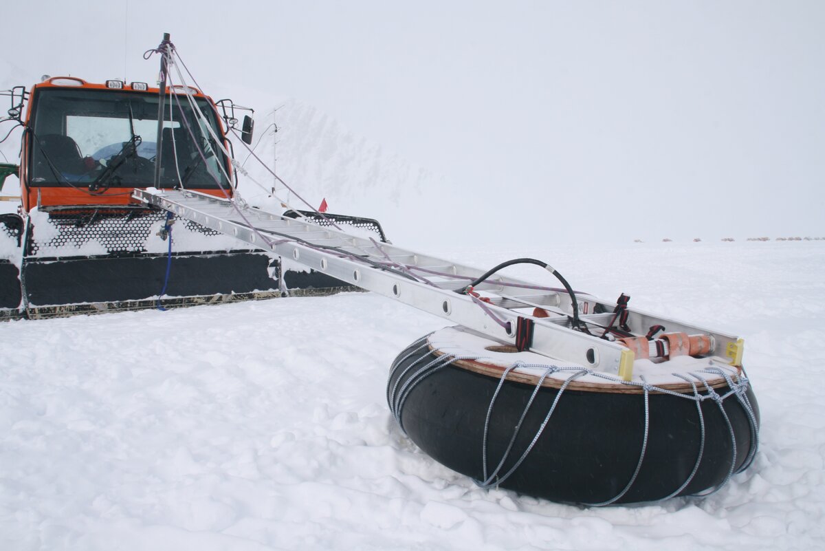 An orange snowcat vehicle on a snowy Antarctic landscape pulls a large metal framework attached to a black tire covered in ropes, likely for scientific research or snow measurement near the South Pole. Visibility is low due to fog or snow.