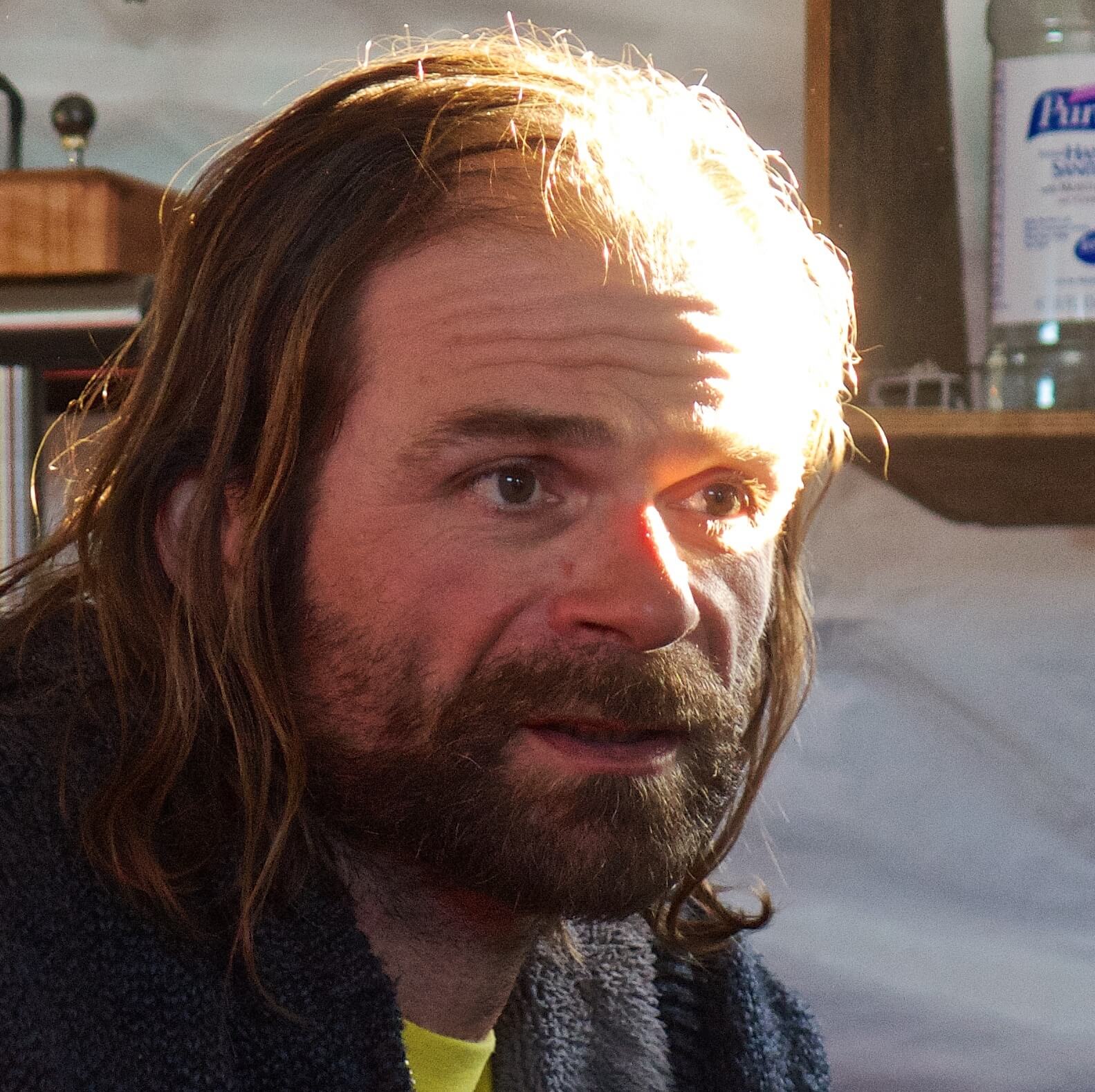 A man with long brown hair and a beard sits indoors, wearing a dark textured sweater. Sunlight highlights part of his hair and face. The background includes shelves with a bottle, books, and memorabilia from Antarctic Logistics and Expeditions.