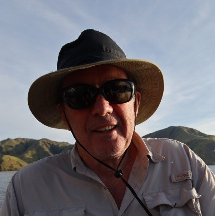 A man wearing a wide-brimmed hat and sunglasses smiles outdoors with hills and a blue sky in the background. He is dressed in a light-colored, button-up shirt, ready for an Antarctic Logistics and Expeditions adventure.