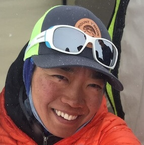A person smiling while wearing a cap, reflective sunglasses, and an orange jacket in Antarctica. Snowflakes dot their face and clothing, with a faint reflection of another person in the Antarctic Logistics and Expeditions sunglasses.