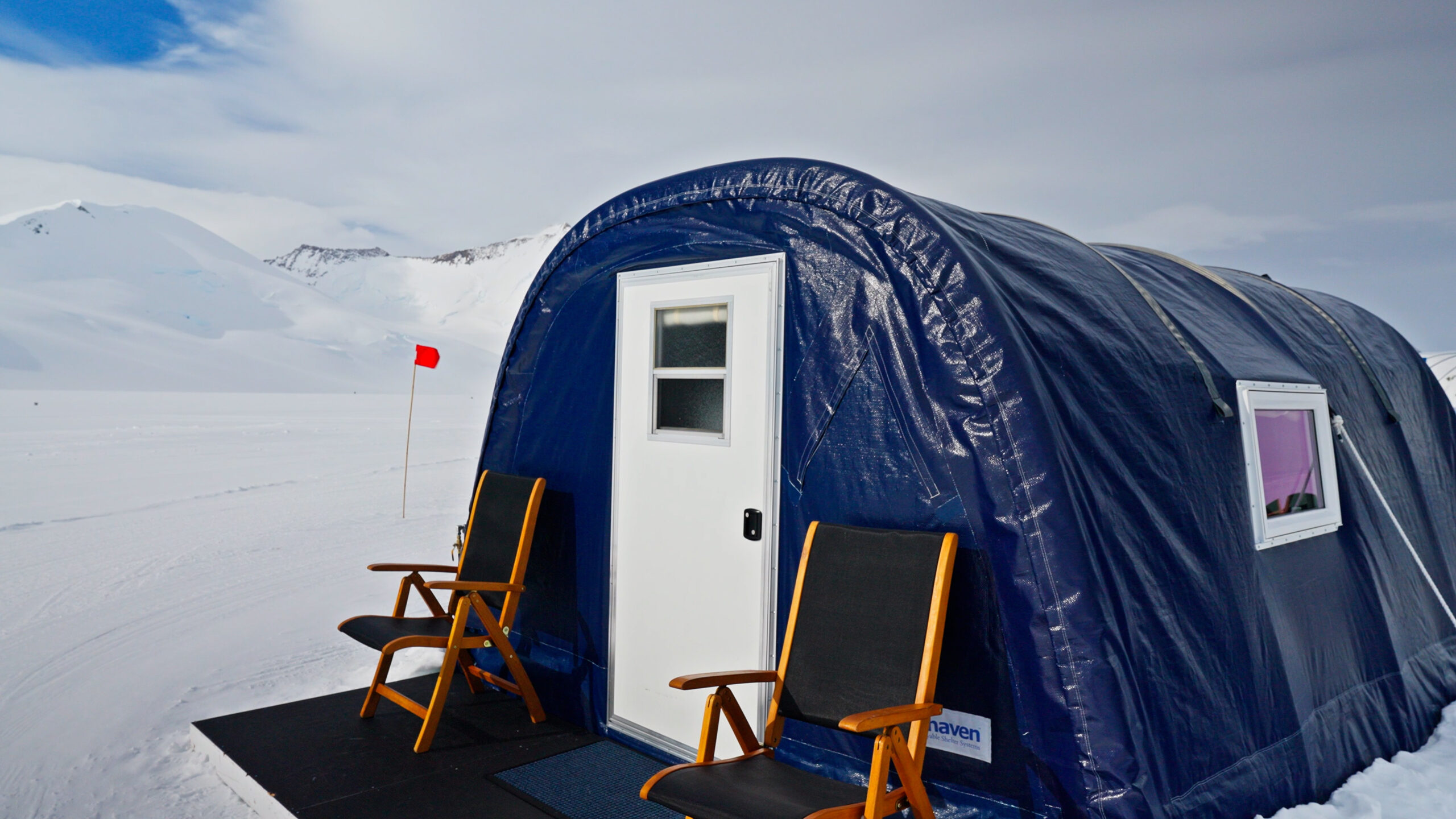 A blue arched tent with a white door and two wooden chairs sits on a snowy landscape, with mountains in the background and a red flag next to the tent.