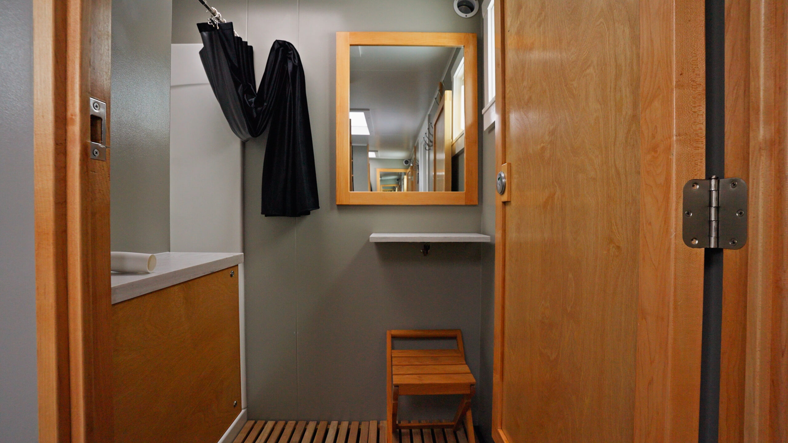 A small, modern bathroom with wood accents, a sink with a counter, a mirror above, a wooden stool, and a shower area with a black curtain. The floor is wooden slats and the door is partially open.
