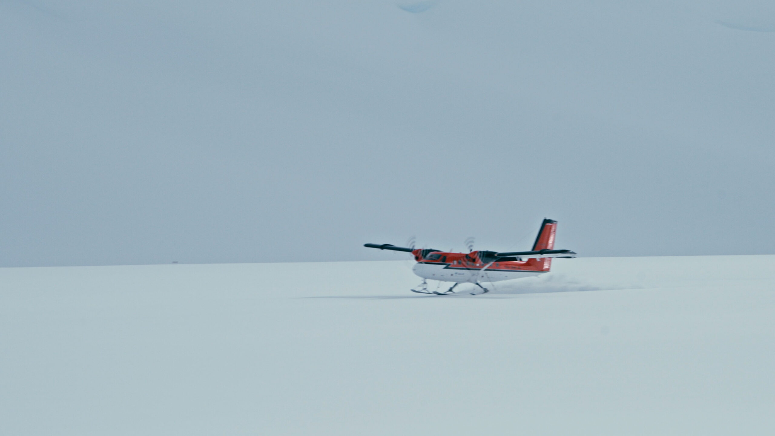 A small red and white propeller plane is landing or taking off on a vast, snowy landscape under an overcast sky.
