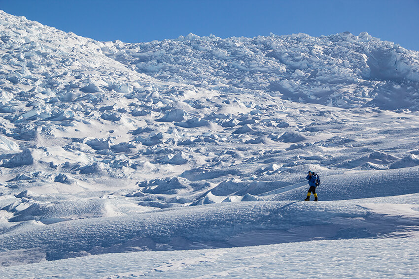 A lone mountaineer wearing winter gear stands on a snow-covered slope in Antarctica, surrounded by vast, rugged, icy terrain with a backdrop of large snowdrifts under a clear blue sky—an adventure supported by Antarctic Logistics and Expeditions.