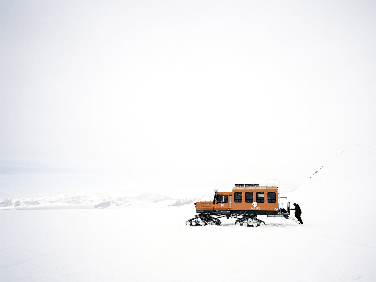 A person stands next to an orange snowcat vehicle on a vast, snowy landscape in Antarctica with distant mountains under an overcast sky, capturing the spirit of Antarctic Logistics and Expeditions.