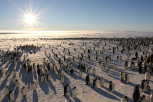Emperor penguin colony from above, with midnight sun low on the horizon